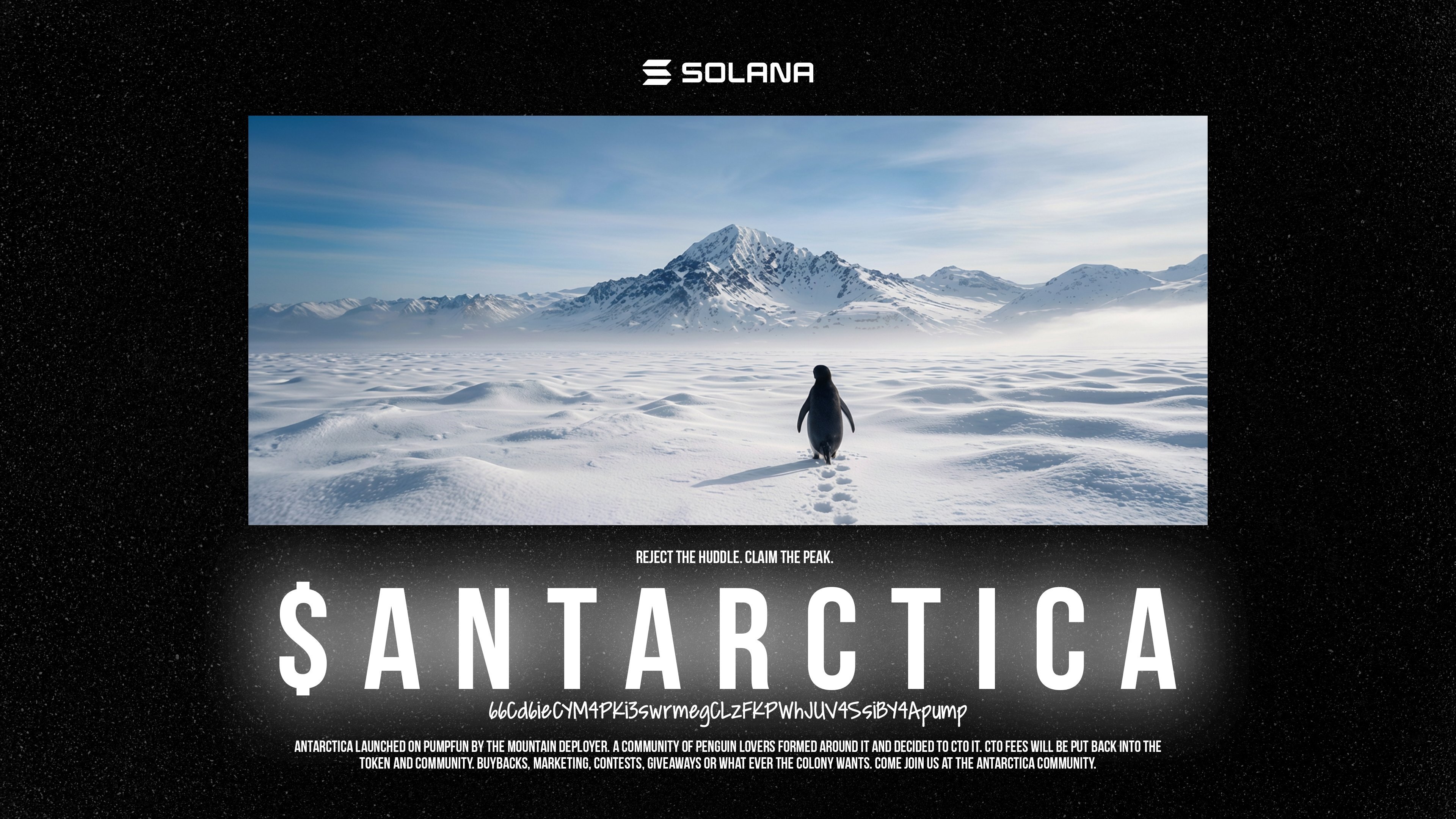 Antarctica launched on pumpfun by the mountain deployer. A community of penguin lovers formed around it and decided to CTO it. CTO fees will be put back into the token and community. Buybacks, marketing, contests, giveaways or what ever the colony wants. Come Join us at the Antarctica Community.